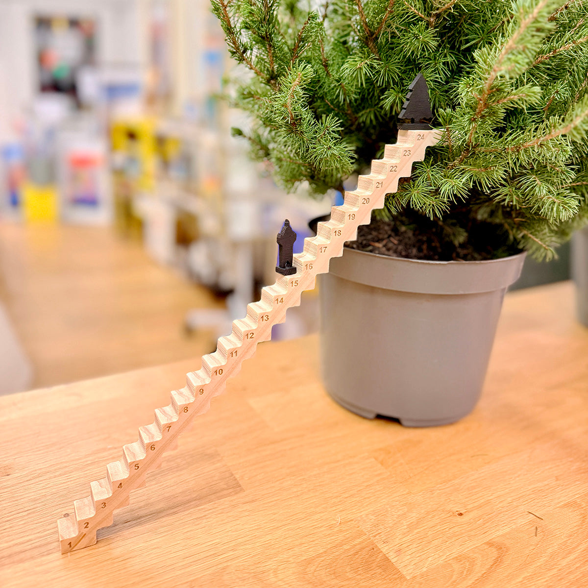 Diese wunderschöne Holztreppe als Adventskalender bringt Weihnachtszauber in dein Zuhause – Tag für Tag ein Stück näher zum grossen Fest. Auf der Seite sind die Zahlen von 1 bis 24 graviert, und mit jeder Stufe steigt die Spannung. Ob auf dem Fenstersims, Regal oder Tisch – die kleine Treppe ist ein echter Hingucker und sorgt für festliche Stimmung.
