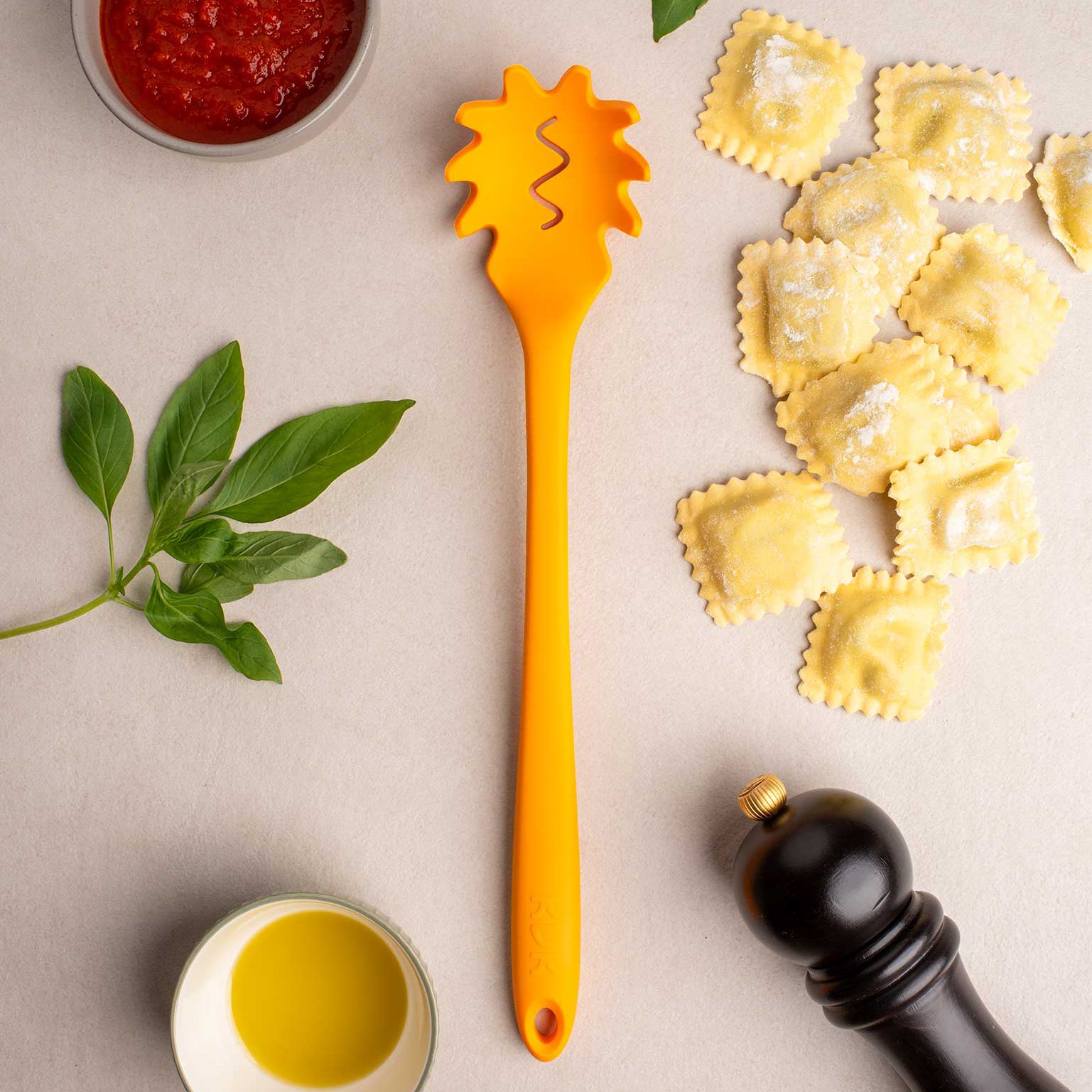 Wenn Pasta auf den Tisch kommt, ist das Nudelmonster nicht weit. Mit seinen clever geformten Zacken greift es Spaghetti, Linguine oder Tagliatelle sicher und hebt sie mühelos aus dem Topf – ganz ohne Abrutschen.