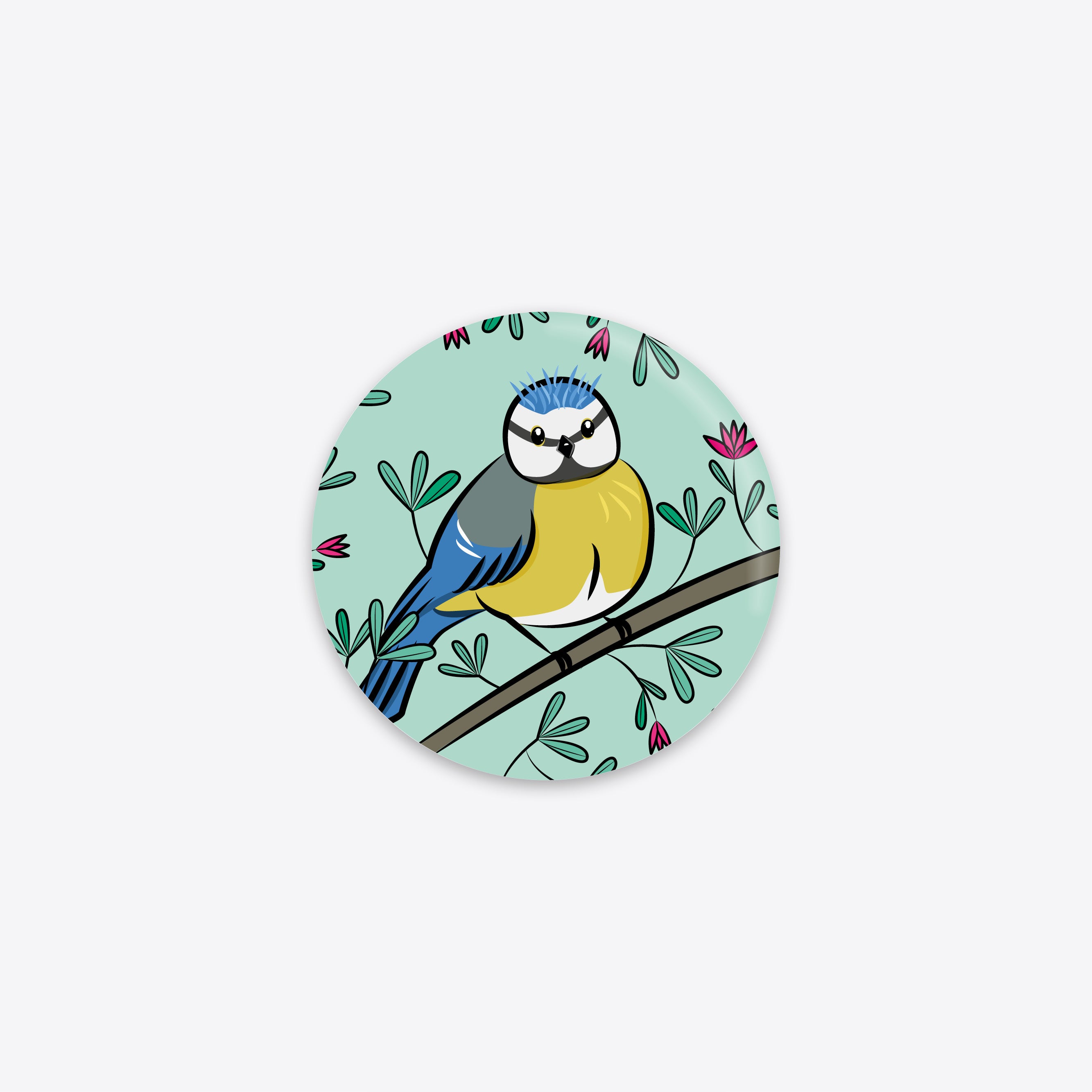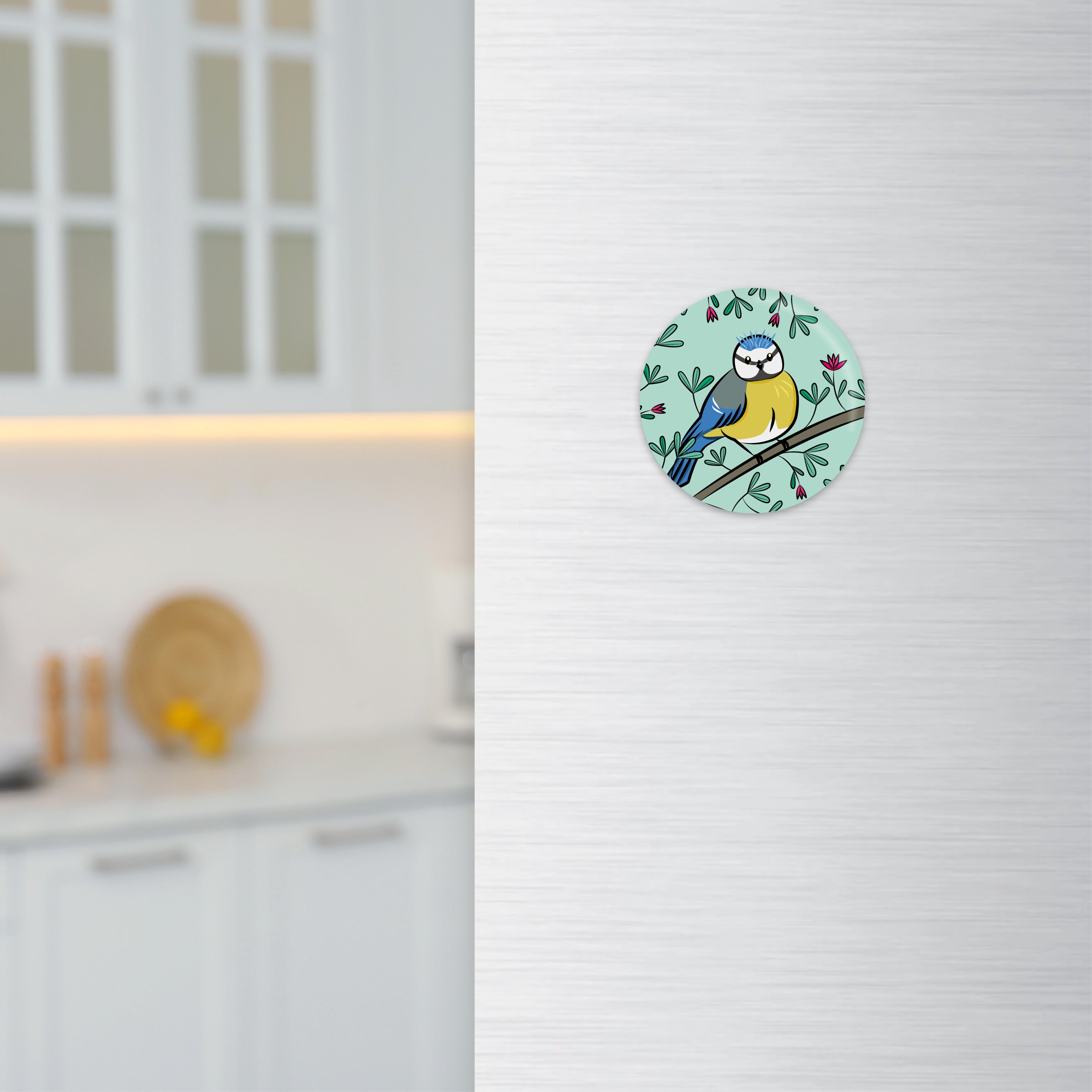 Hol dir pure Lebensfreude direkt nach Hause! Das Magnet «Sam» zeigt die fröhliche Blaumeise mit ihrem strahlend blau-gelben Gefieder – liebevoll illustriert von Reana Hostettler. Umgeben von leuchtenden Blumen bringt dieses detailreiche Blumentier-Motiv Farbe, Leichtigkeit und ein kleines Stück Natur an Kühlschrank, Magnetwand oder Büro.