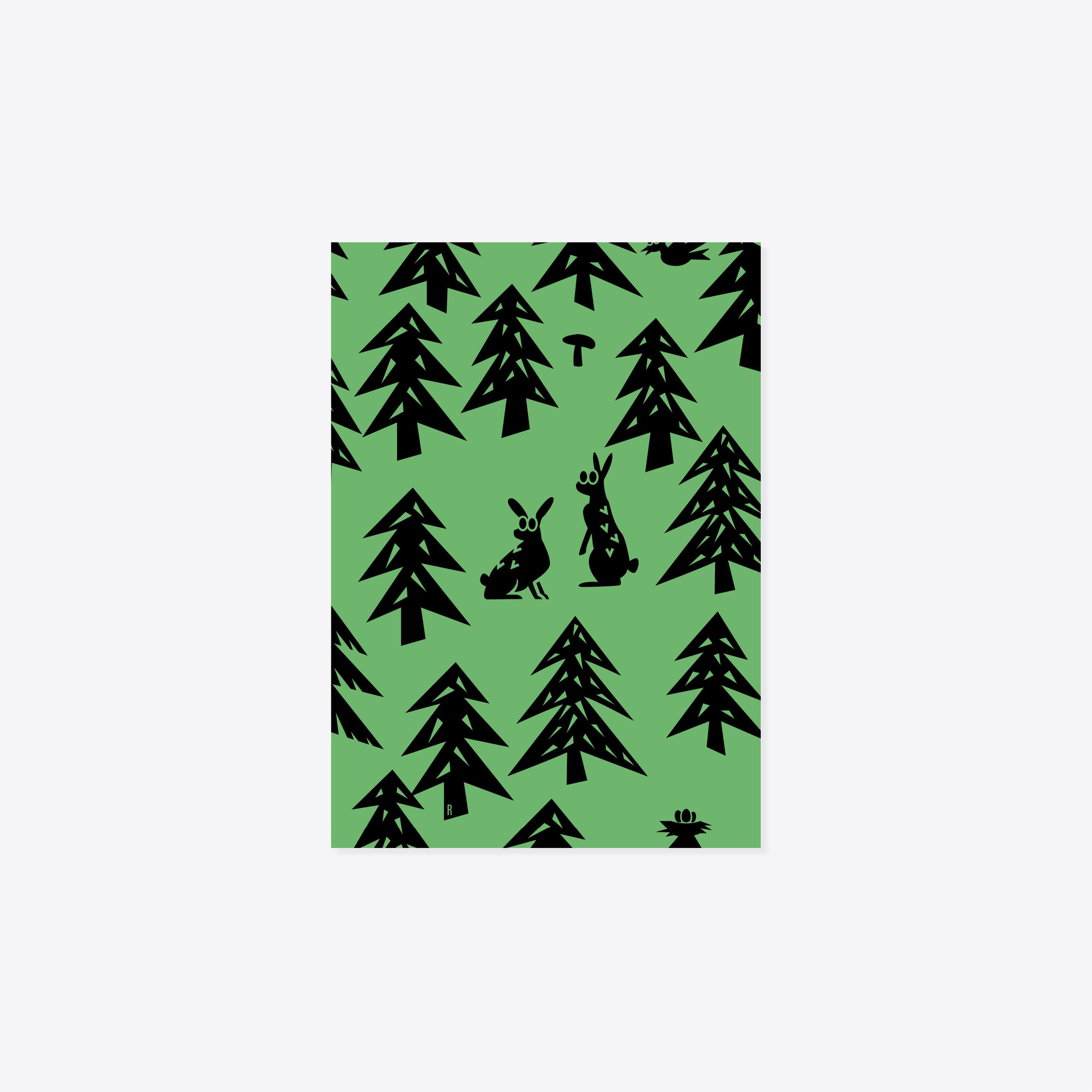 Diese Postkarte zeigt zwei Hasen, die Ausschau halten in der wohltuenden Atmosphäre der Wälder.